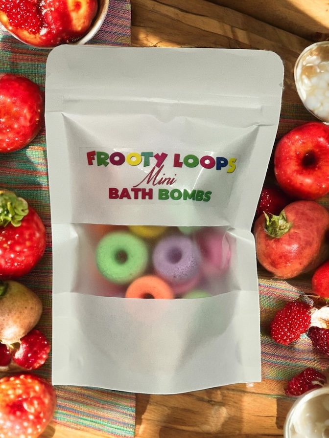 Bring a splash of fun with our Frooty Loops Mini Bath Bombs! These colorful vibrant mini bath bombs come in playful shades of blue, green, yellow, pink and purple — and have hints of zesty citrus, sweet berries, and that unmistakable fruity cereal scent.